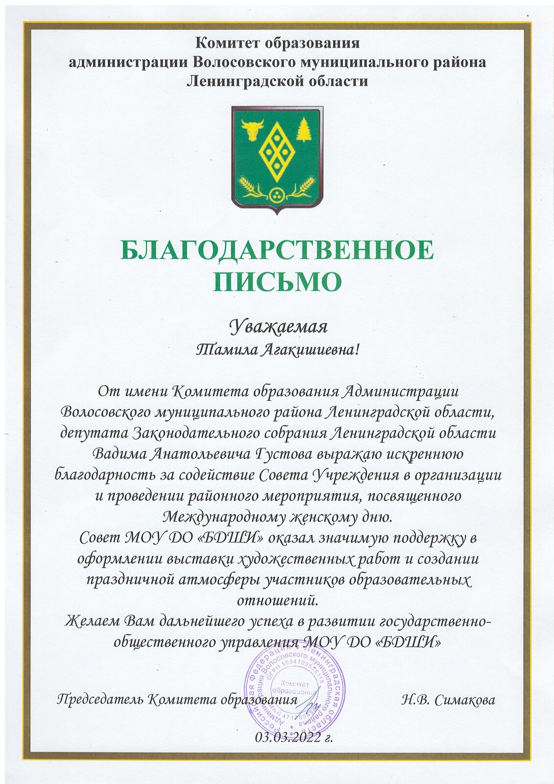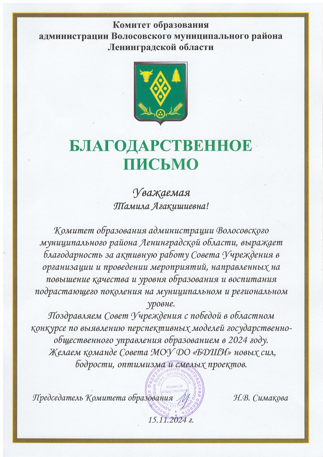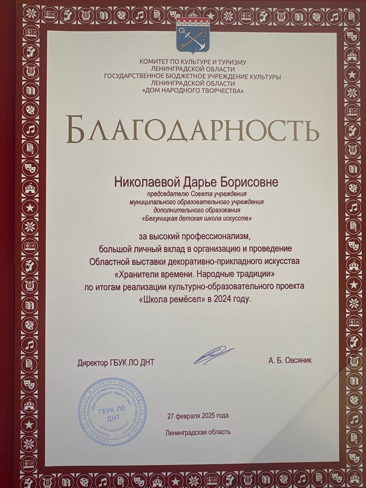 Благодарность за содействие в организации и проведение социально-значимого проекта "Народные игры на улице" (Ленинградское областное отделение общероссийской общественной организации "Российский фольклорный союз")Член УС Николаева Д.Б Благодарность - выставка Чиновник тоже Человек Иванова Т.А.2024 Благодарственное письмо УС за разработку проекта 2025 (ООО"Нева-Балт") Благодарственное письмо УС за разработку логотипа 2024 (ООО"Нева-Балт") |